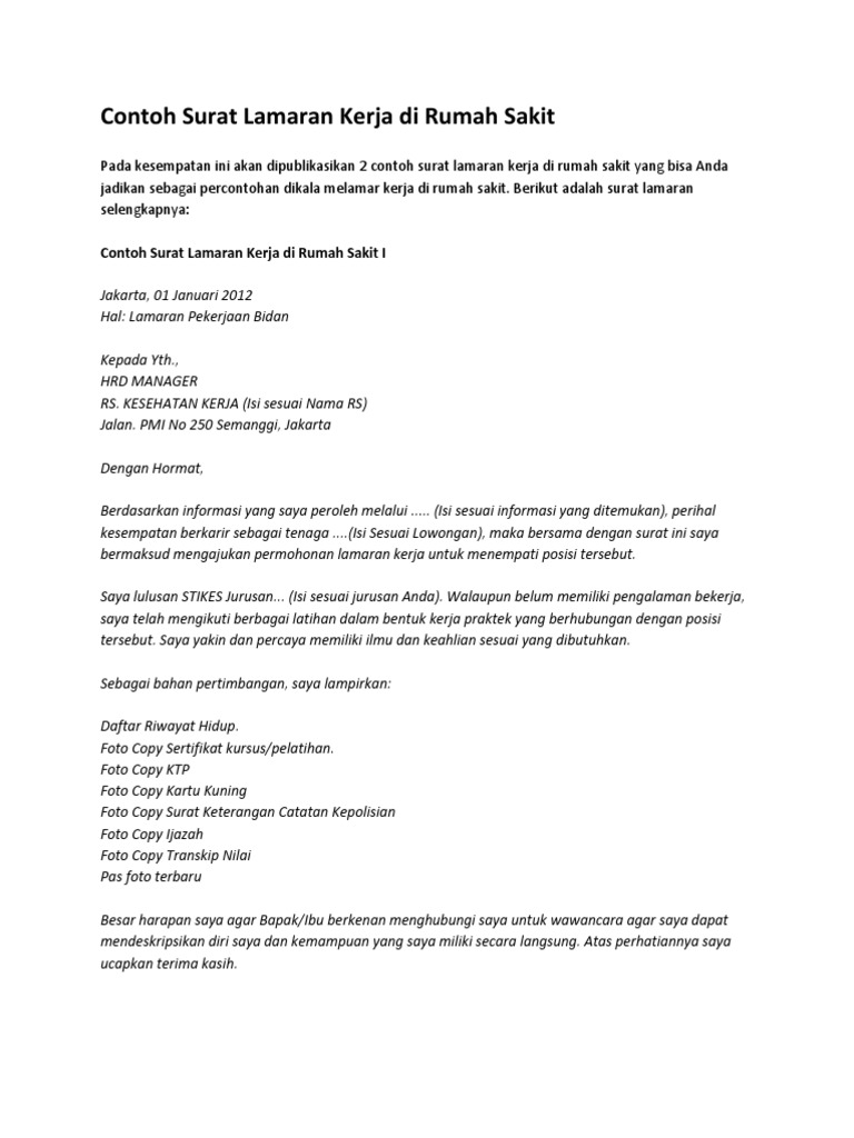 Contoh Surat Lamaran Kerja Di Rumah Sakit Berbagai Posisi Dan Jabatan from kotakpintar.com Agar anda bisa bekerja di rumah sakit untuk sebuah posisi tertentu, pastinya anda harus melamar pekerjan terlebih dahulu. Apalagi bila anda sudah berkeluarga dan anda adalah seorang suami. Dengan surat lamaran kerja ini bermaksud untuk mengajukan permohonan lamaran kerja untuk menempati posisi sebagai perawat di rumah sakit husada pertiwi. Kerja di rumah sakit tidak harus selalu menjadi dokter, karena rumah sakit memiliki manajemen bisnis yang kompleks. Demikian surat lamaran kerja ini saya sampaikan, atas perhatiannya saya ucapkan terimakasih. Maka, tentu bekerja menjadi hal yang wajib bagi anda. Bagi yang butuh contoh surat lamaran kerja perawat, di artikel ini kami akan sharing kepada anda. 3.1 tips melamar kerja yang baik.